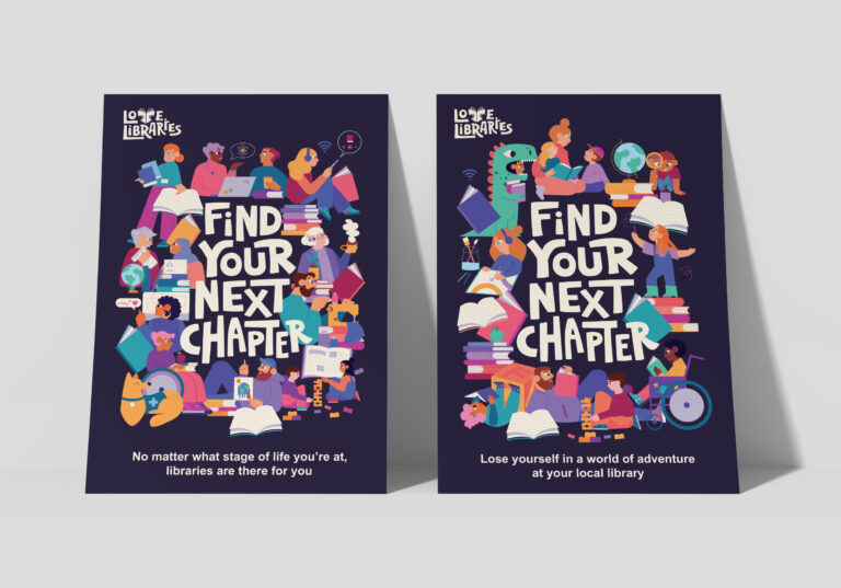 We created a full campaign identity for Love Libraries – Find Your Next Chapter, a national initiative led by the National Library of Scotland to support and promote libraries across the country. The campaign aimed to reposition libraries as vibrant, essential public spaces that serve communities at every stage of life.